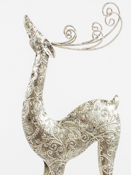 Decorative, elegant standing reindeer with a silver patterned finish and swirly antlers.