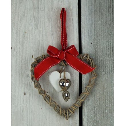 Festive woven wooden heart with inner hanging hearts finished with a pretty red bow.